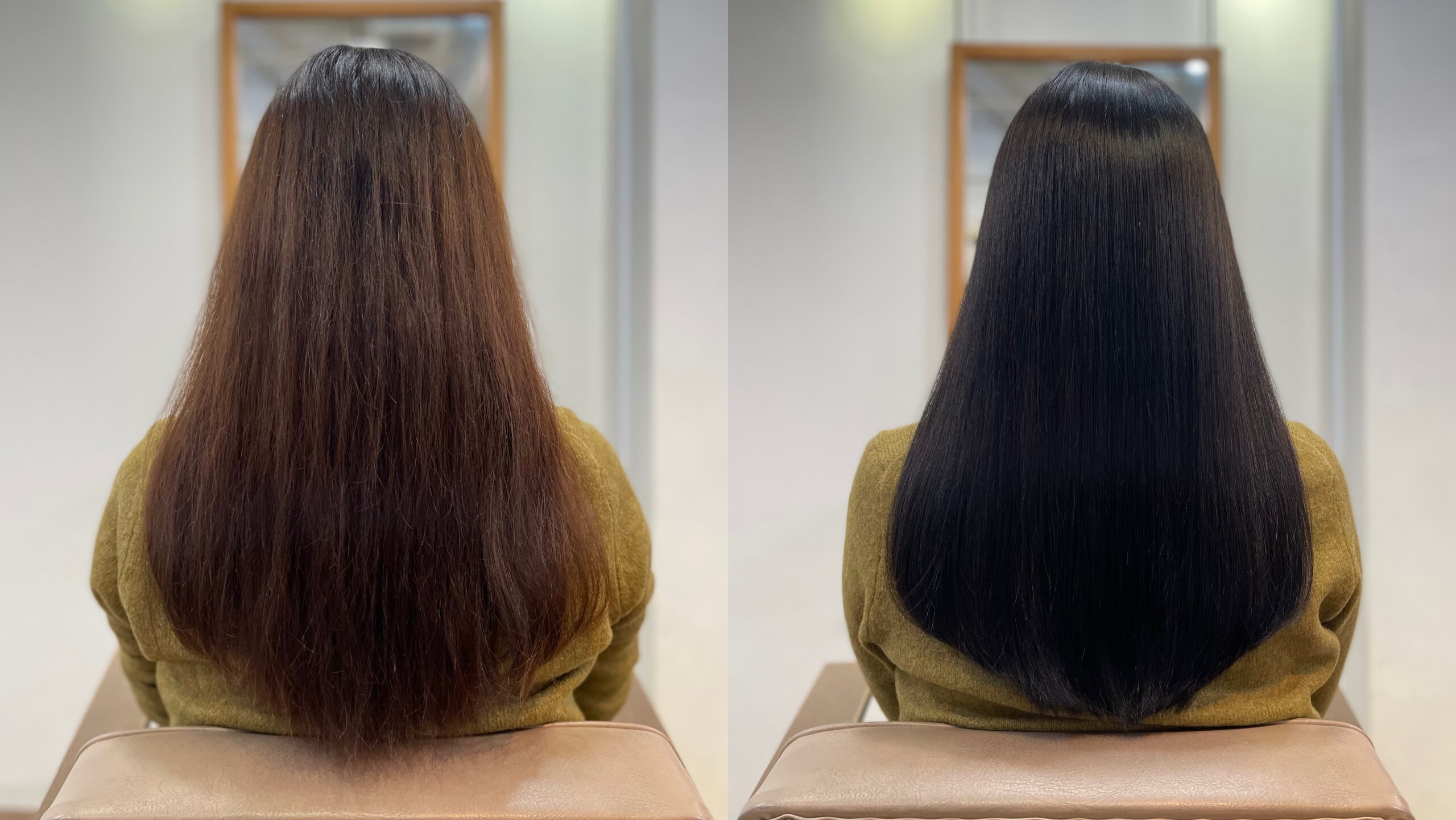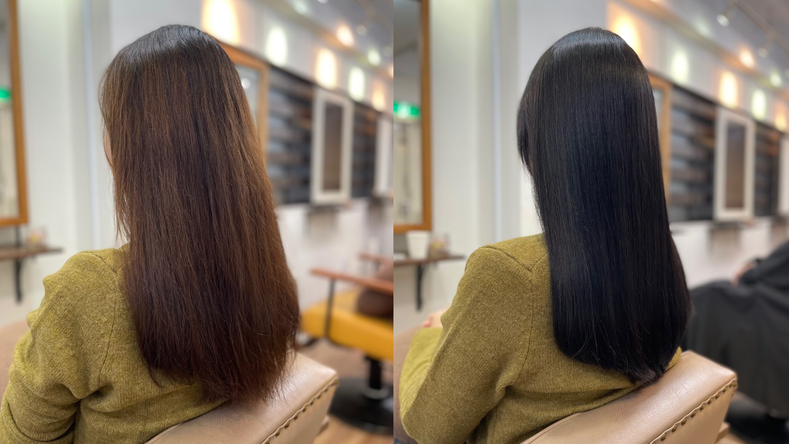 いきなり初回で地毛と同じ明るさにすると、ギャップがありすぎて黒く感じてしまうので、地毛よりも少し明るいくらいで初回は染めていくことが多いです。