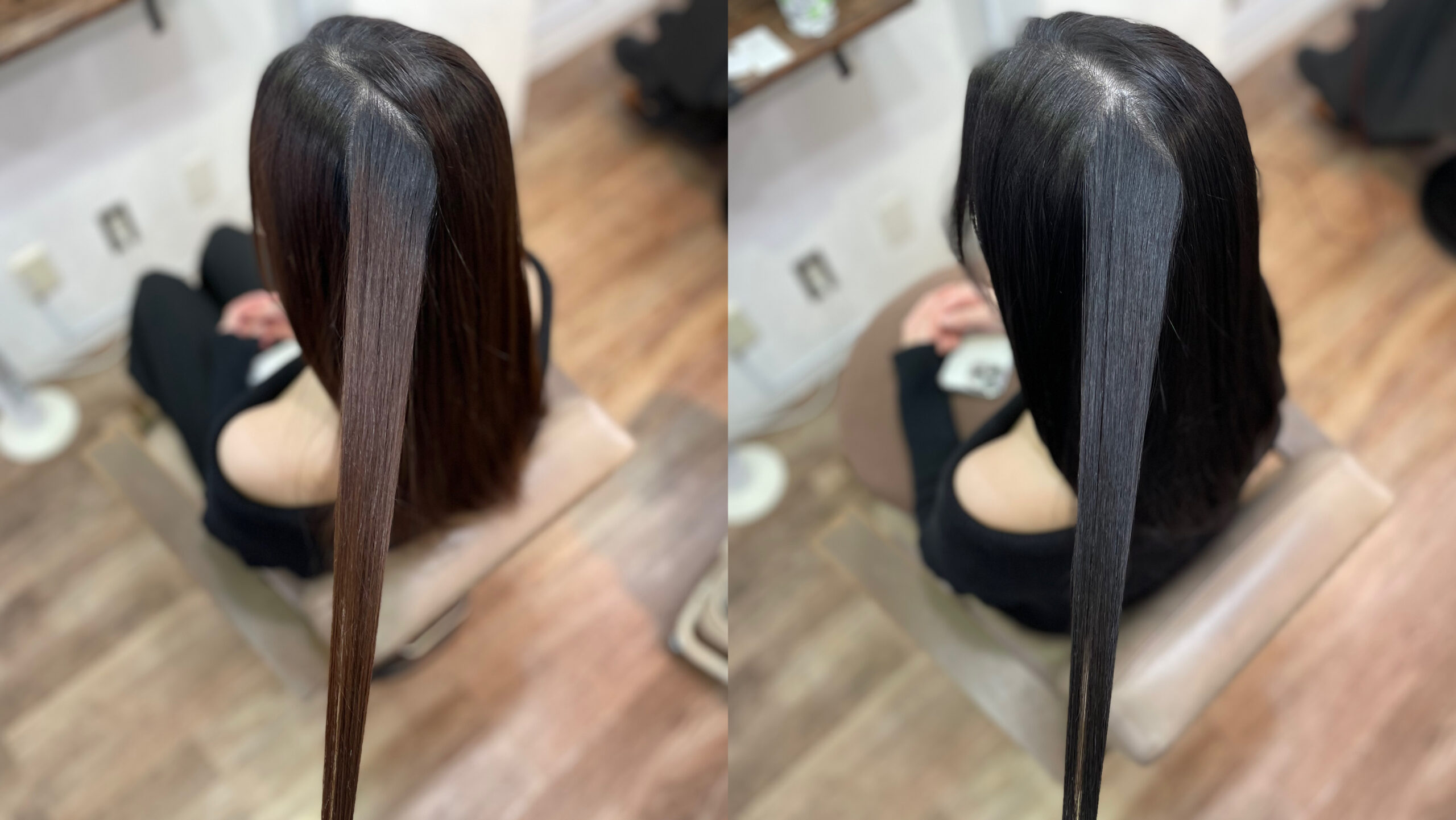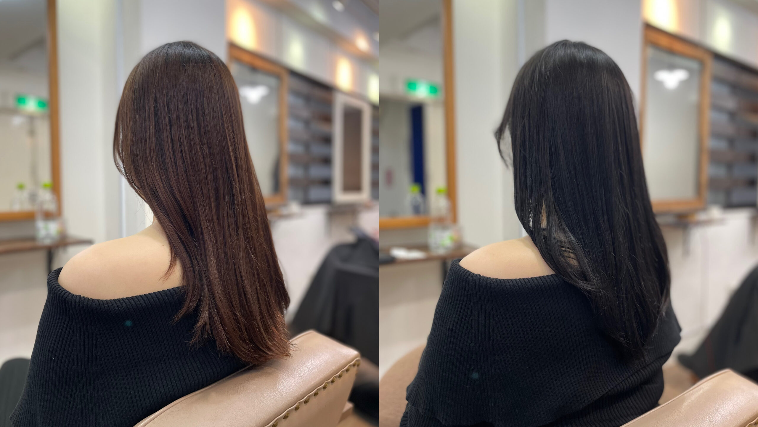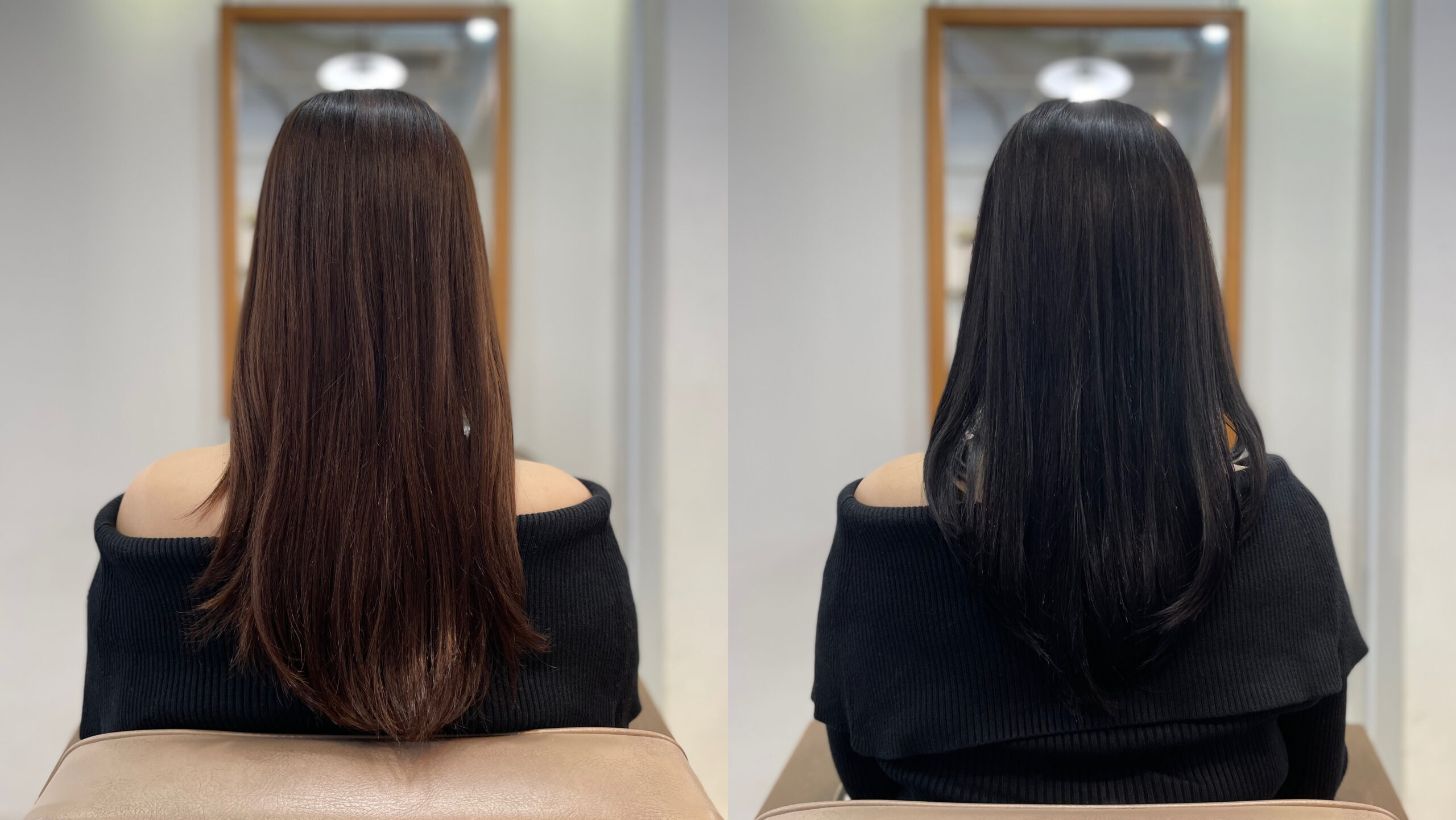 いきなり初回で地毛と同じ明るさにすると、ギャップがありすぎて黒く感じてしまうので、地毛よりも少し明るいくらいで初回は染めていくことが多いです。