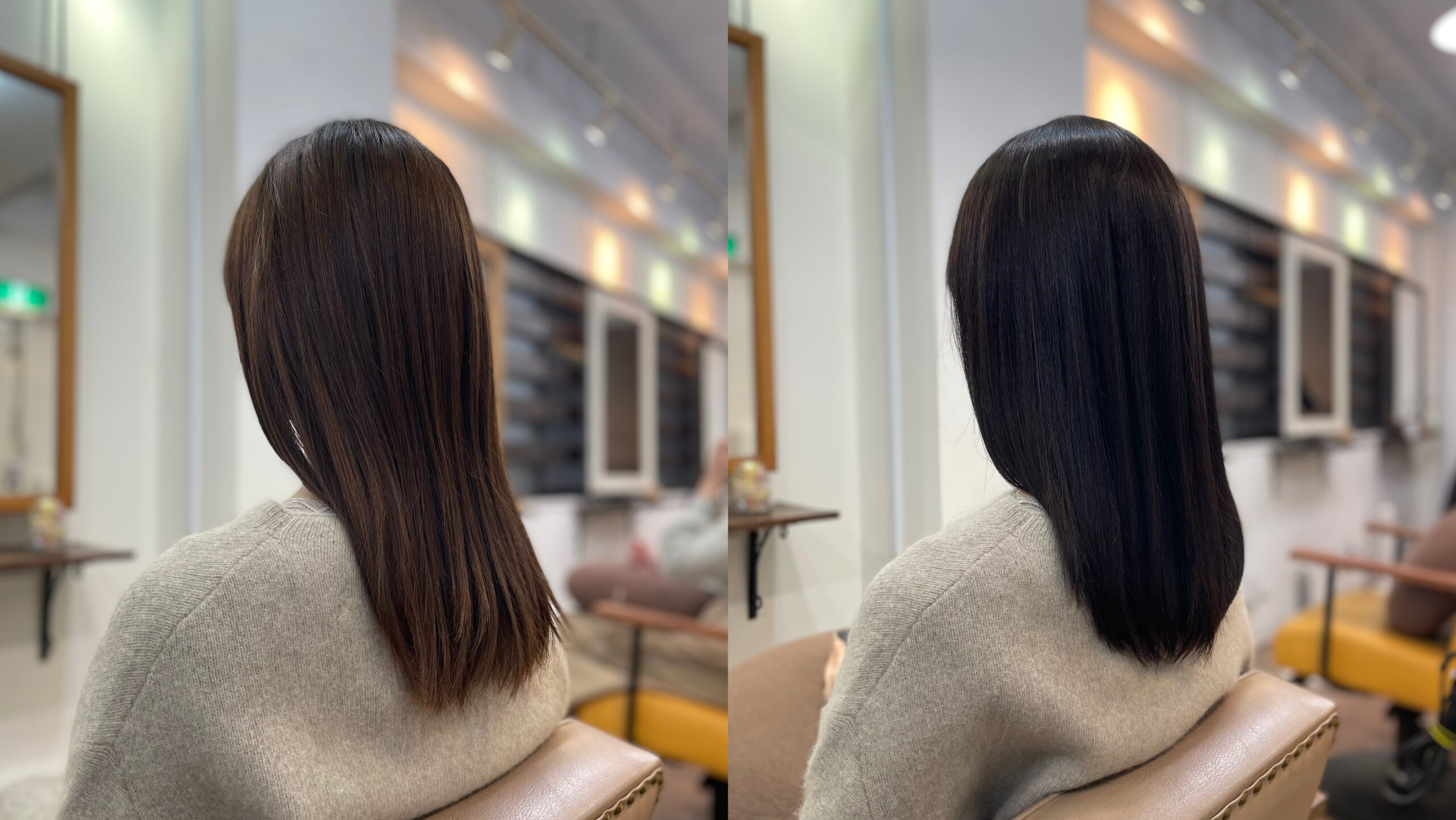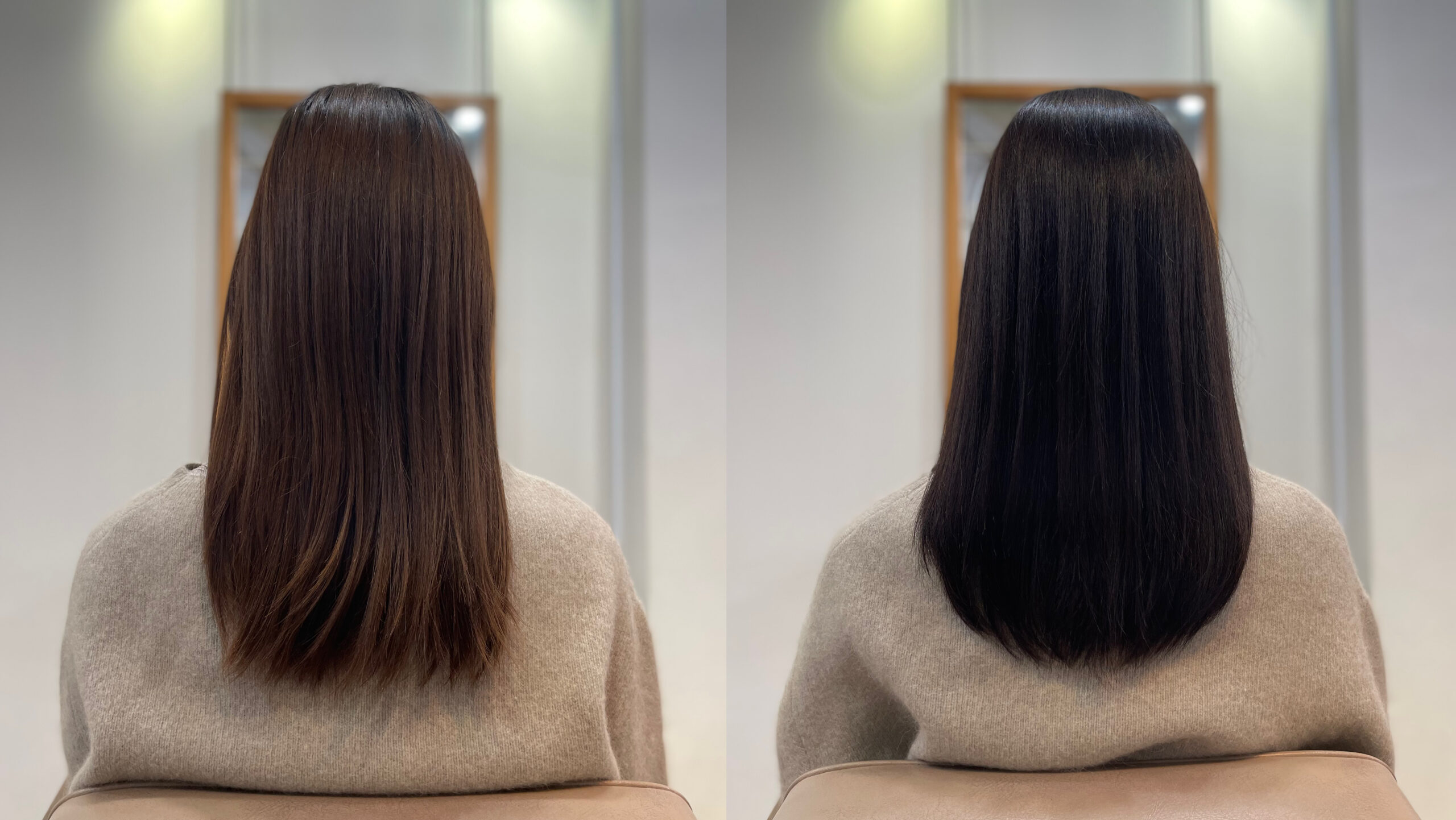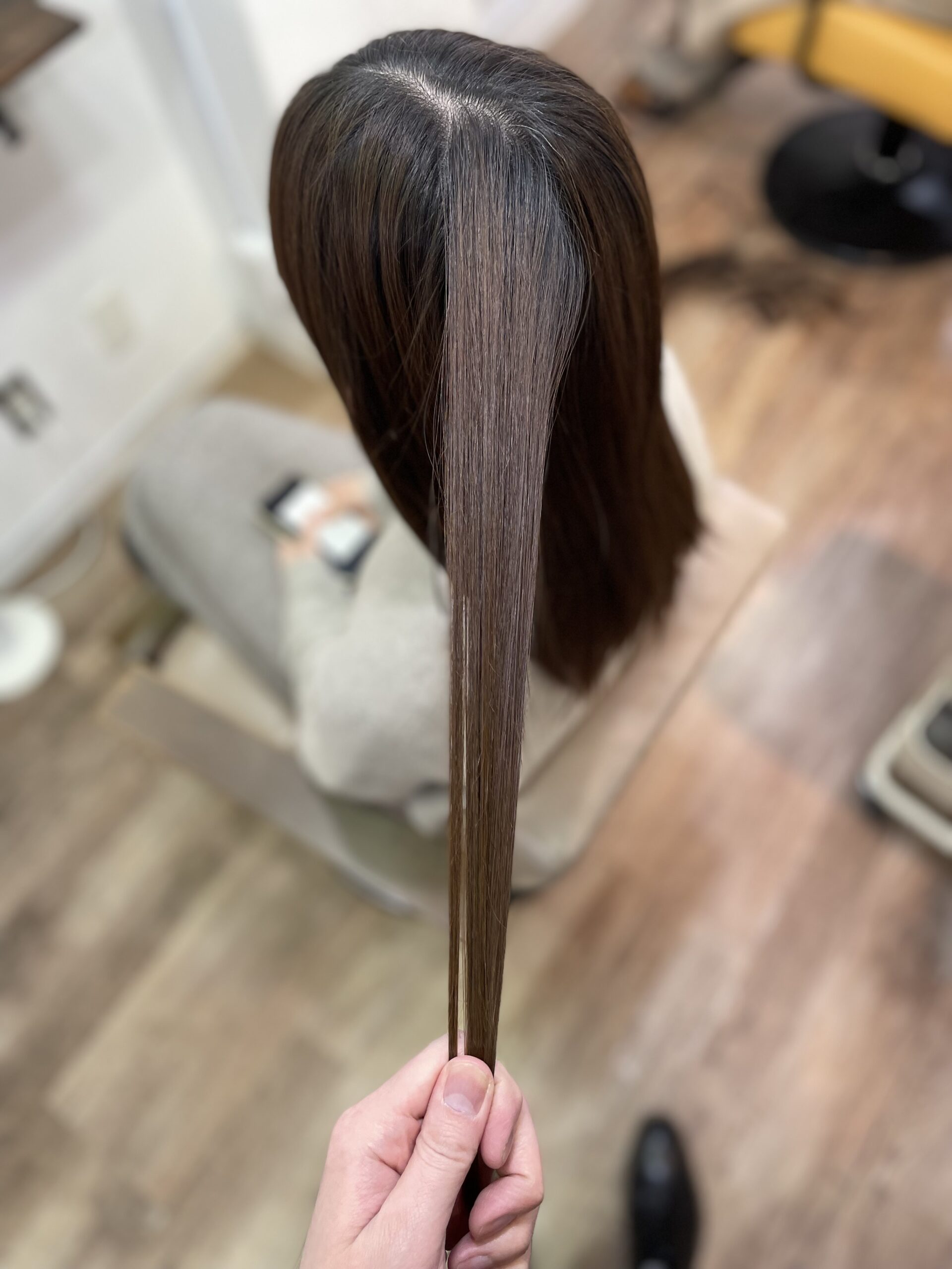 いきなり初回で地毛と同じ明るさにすると、ギャップがありすぎて黒く感じてしまうので、地毛よりも少し明るいくらいで初回は染めていくことが多いです。