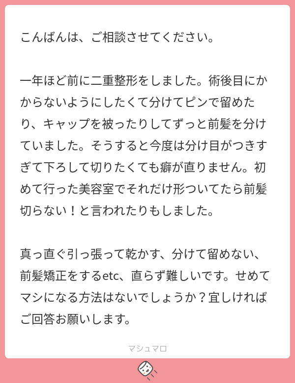 一年ほど前に二重整形をしました。術後目にかからないようにしたくて分けてピンで留めたり、キャップを被ったりしてずっと前髪を分けていました。そうすると今度は分け目がつきすぎて下ろして切りたくても癖が直りません。初めて行った美容室でそれだけ形ついてたら前髪切らない!と言われたりもしました。