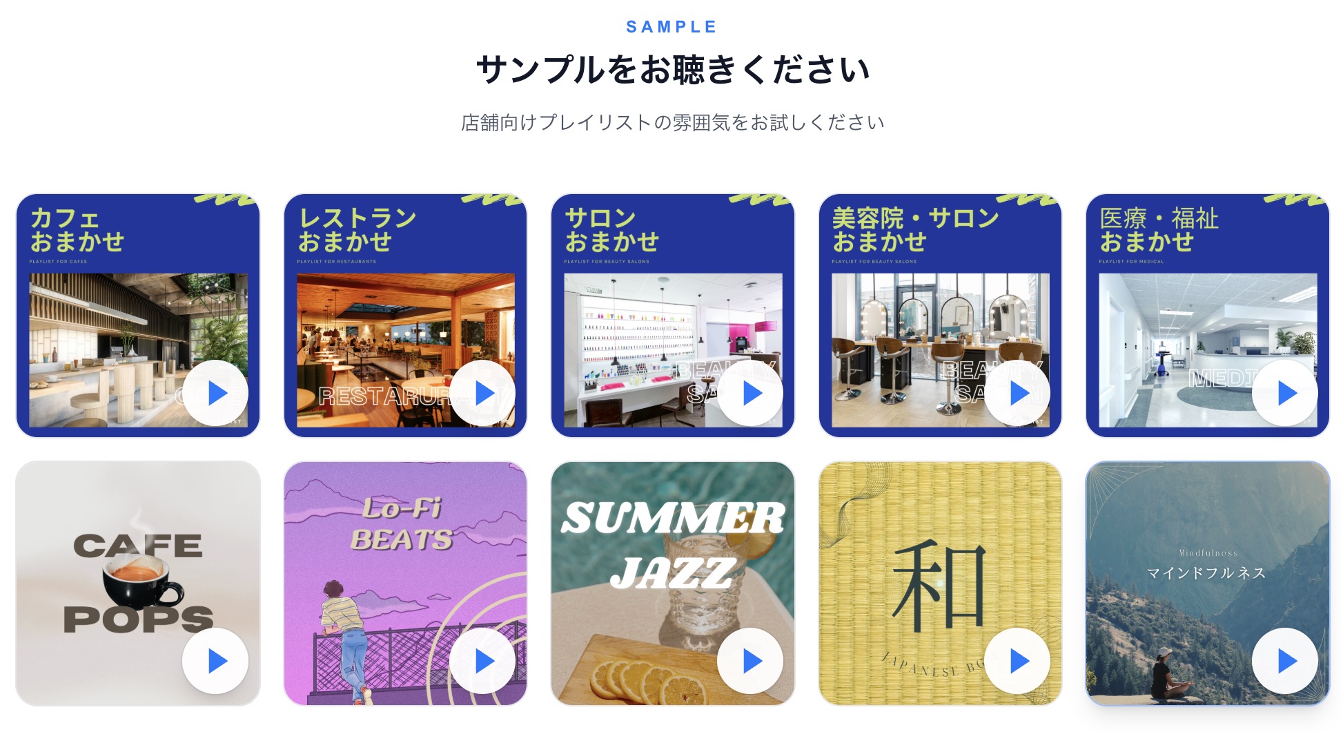 BGM Proでは、AIで制作された店舗向け楽曲を提供しており、すべて商用利用が可能だ。プレイリストは業種や雰囲気ごとに用意されており、レストラン、カフェ、美容室・サロン、フィットネス、クリニック、ホテルなど用途に応じて選択できる。ジャンルもポップス、ジャズ、クラシック、LoFi、ボサノバ、自然音など多彩にそろえる。